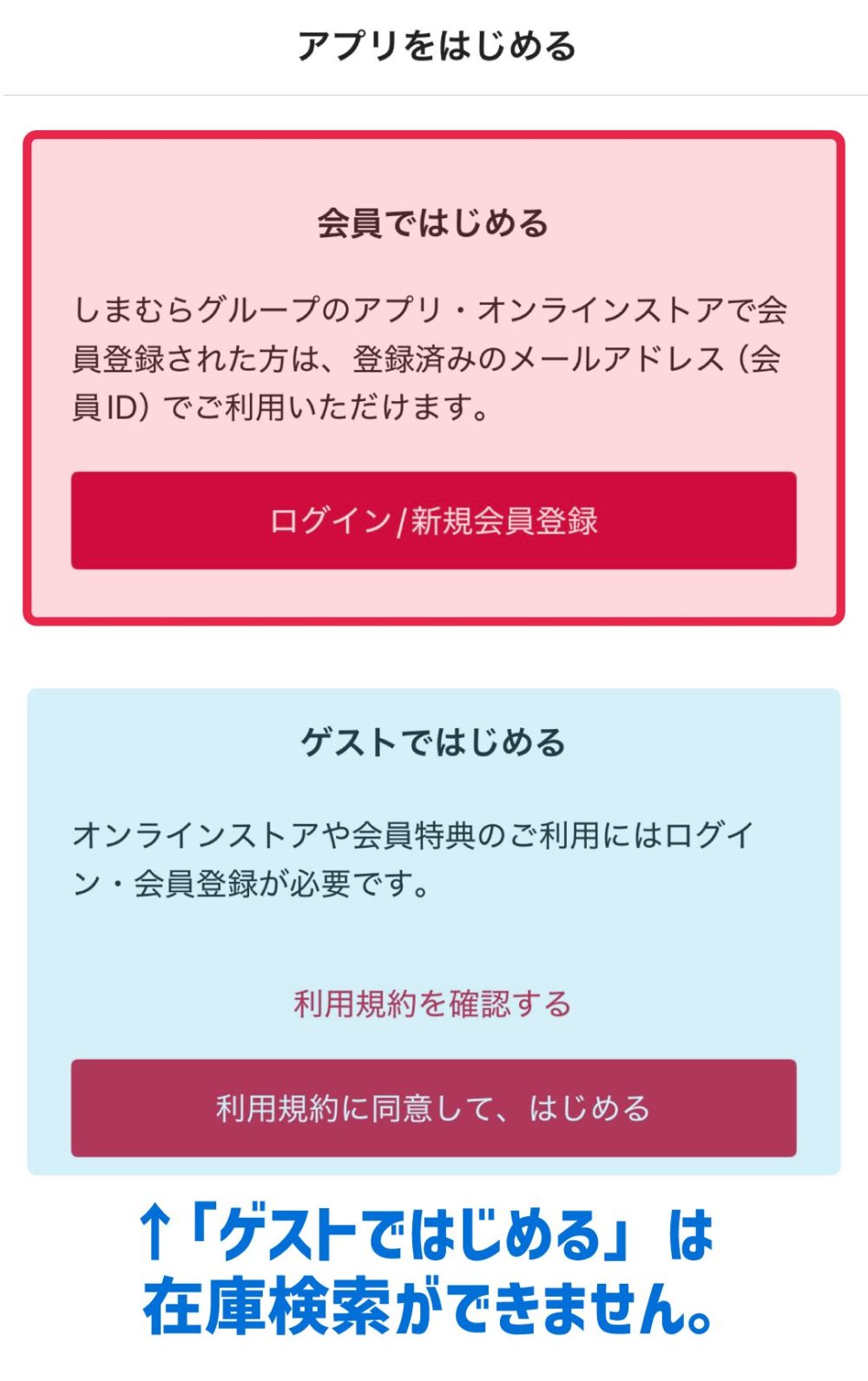 「在庫検索」機能を利用するには、バースデイ(またはしまむらグループ)の会員である必要があります。まだ、会員でない方は、この後登録の手順を画像付きで丁寧に解説しておりますので参考にしてみてください。